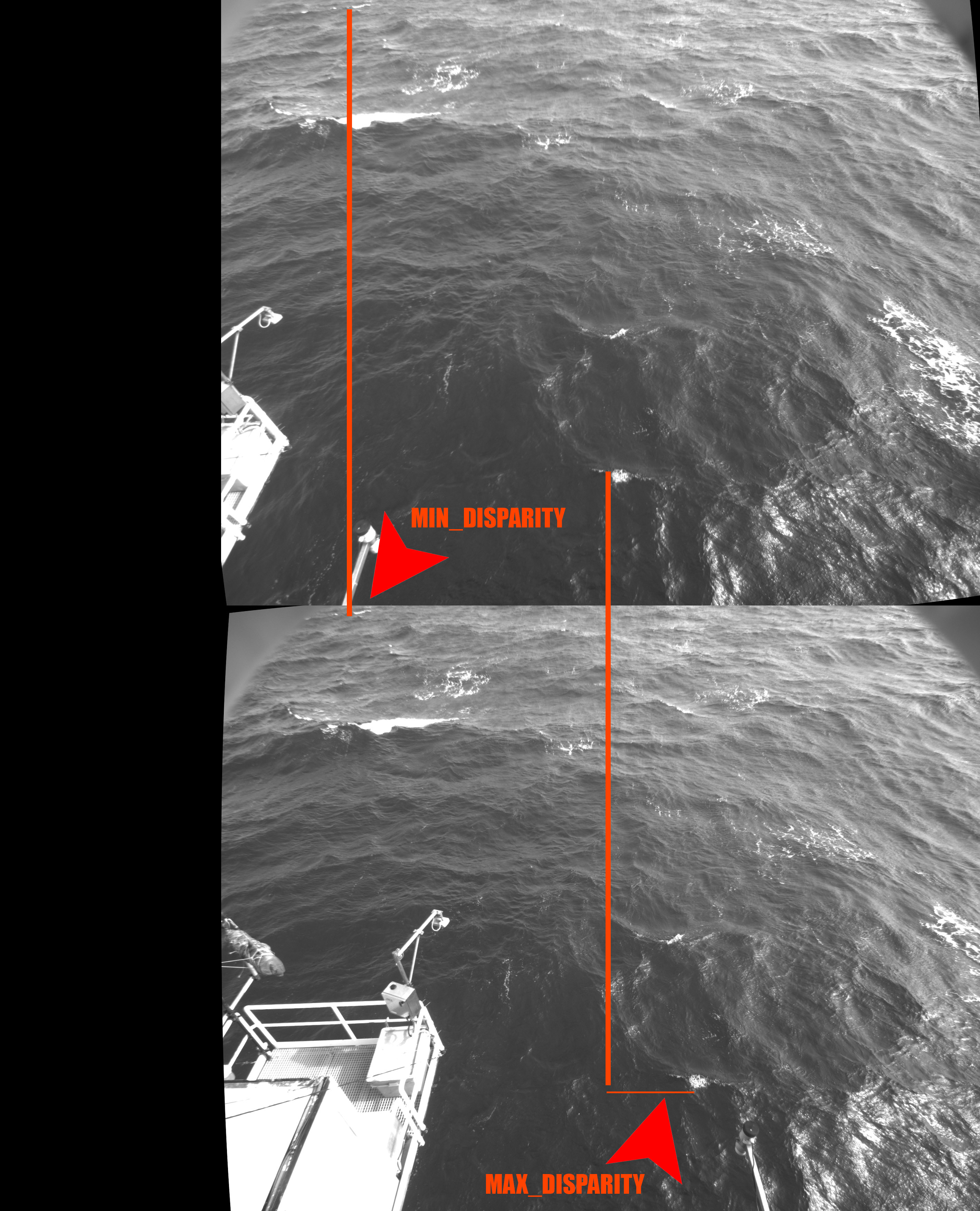 The default configuration parameters have been tuned considering a stereo rig composed by 5 megapixel cameras placed side-by-side with parallel optical axis, placed at about 10m above the sea level and facing downward at about 20° with respect to the horizon. A different configuration is possible but will probably require an adjustment of the configuration parameters.